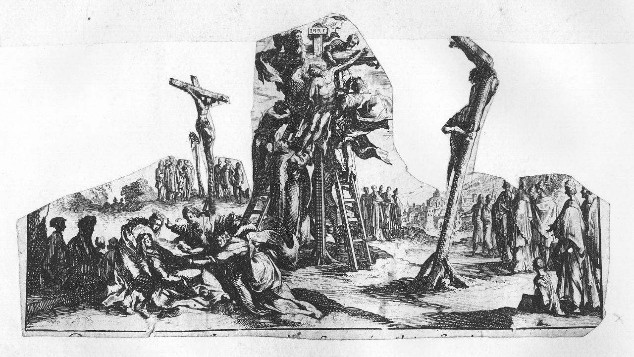 Personaggi: Cristo; Madonna; Santa Maria Maddalena. Figure: ladroni; apostoli; soldati. Oggetti: croce; scale. Paesaggi: rocce; città; cielo; nuvole