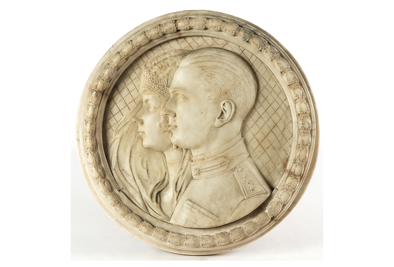 Doppio ritratto con figure femminile e maschile volte a sinistra. I due profili appaiono leggermente sovrapposti, l’una indossa diadema e velo mosso dal vento, l’altro l’uniforme. Sullo sfondo è tracciato un motivo reticolato obliquo. La circonferenza è incorniciata da una ghirlanda di boccioli concatenati.. Ritratti. Personaggi: Maria Josè del Belgio; Umberto II di Savoia