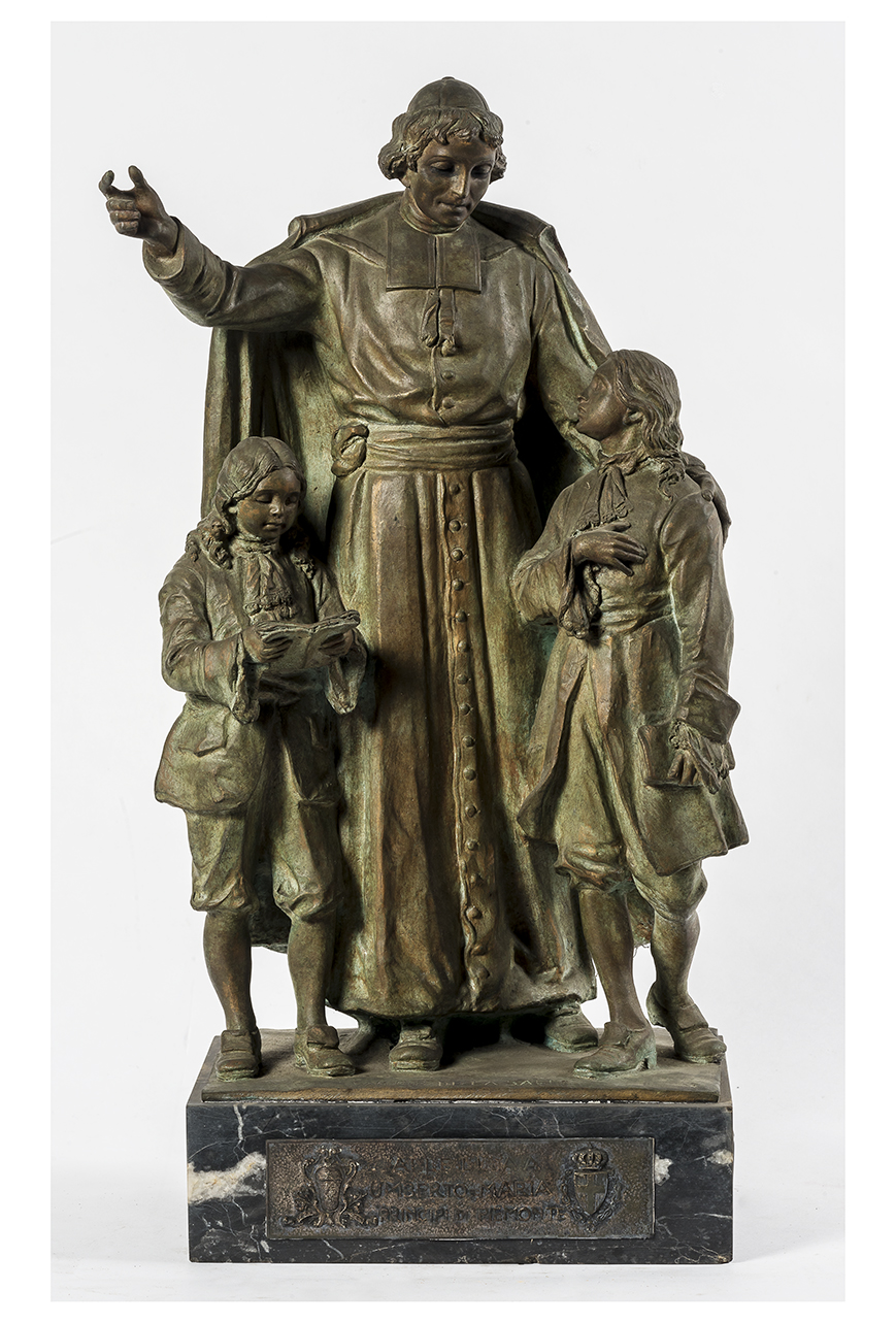 Gruppo raffigurante Giovanni Battista de La Salle con due fanciulli. Il prelato veste zuccotto e abito talare, ha il braccio destro levato verso l’alto e la mano sinistra appoggiato alle spalle del più grande, che ha una mano sul petto e con l’altra regge un libro; il più piccolo è intento nella lettura. Scultura dotata di zoccolo in marmo nero venato di bianco, recante iscrizioni. Targhetta frontale con stemmi.. Personaggi: San Giovanni Battista de La Salle. Figure: fanciulli. Oggetti: libri