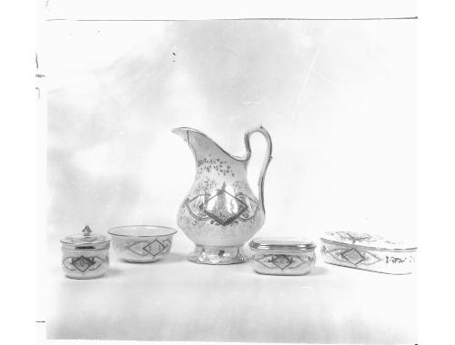 Un servizio da toeletta decorato a fregi rossi, blu e oo su fondo bianco. Manico della brocca e bordi filettati in oro. Comprende: una brocca; una catinella; due scatole; un boccettino e una vaschetta.. n.p