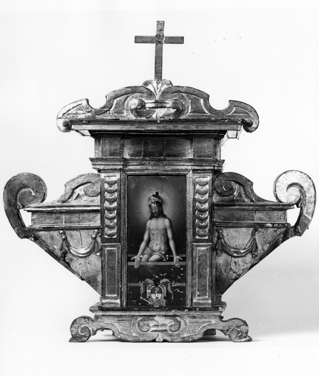 Urna a struttura sagomata, alzata con fastigio a volute e crocetta apicale. Porticina rettangolare dipinta.. n.p