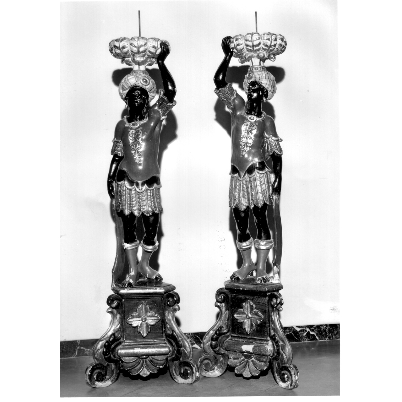 I due Mori, perfettamente uguali tra loro, sono collocati in piedi su un alto basamento dipinto di marrone, decorato al centro con un motivo di foglie e ai lati da riccioli e volute dorate. Sopra le loro teste, sormontate da turbanti bianchi con righe multicolori, è applicato il piatto "reggi-candela" a forma di fiore.. Soggetti profani. Figure maschili: mori. Abbigliamento: turbante bianco con righe multicolori; corpetto terminante a punta sotto la vita dipinto di verde con decorazioni; gonnellino a frange dorate; calze rossi con i risvolti dorati. Armi: scimitarra rossa