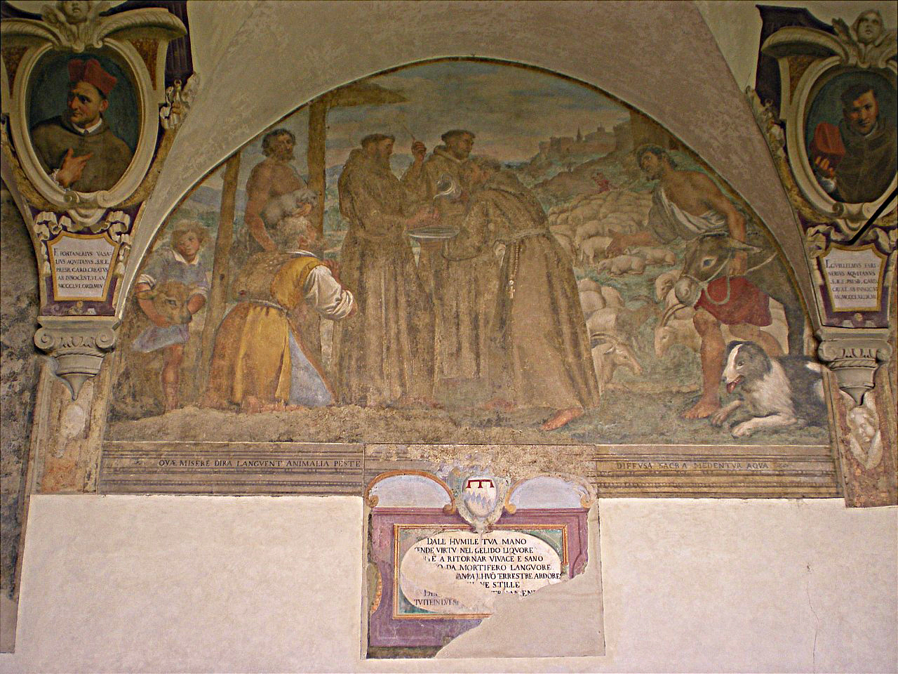 Anche l'episodio raffigurato nella terz'ultima lunetta della parete est è tratto dalle "Croniche" di Marco da Lisbona (Amonaci 1989) dove si racconta di uno dei tanti miracoli legati a San Francesco, il quale, con l'acqua servita a lavare le sue mani piagate, operava guarigioni miracolose. E' il caso del momento rappresentato nella scena in questione, in cui, tale acqua prodigiosa viene gettata su di un gregge di animali di un paesino di Rieti, che, colpiti da una grave pestilenza, improvvisamente tornano a essere sani. La composizione, dagli spazi sempre ben equilibrati ma di più ampio respiro rispetto alle precedenti, e dalle sapienti notazioni paessagistiche si dispone essenzialmente su due piani. Quello principale, il primo, è occupato dal gruppo dei tre frati al centro e dei pastori, che, con i loro gesti dai ritmi lenti e cadenzati scandiscono la scena; lo sfondo è dedicato alla descrizione del paesaggio collinare di Rieti con un folto gregge che, spinto da un pastore, si dirige in direzione di San Francesco per essere sanato. Personaggi: San Francesco. Figure maschili: frati francescani; pastori. Abbigliamento religioso. Abbigliamento: moderno. Animali: gregge; mucca; cane; asino. Paesaggi: collinare. Vedute: città di Rieti. Vegetali: prato