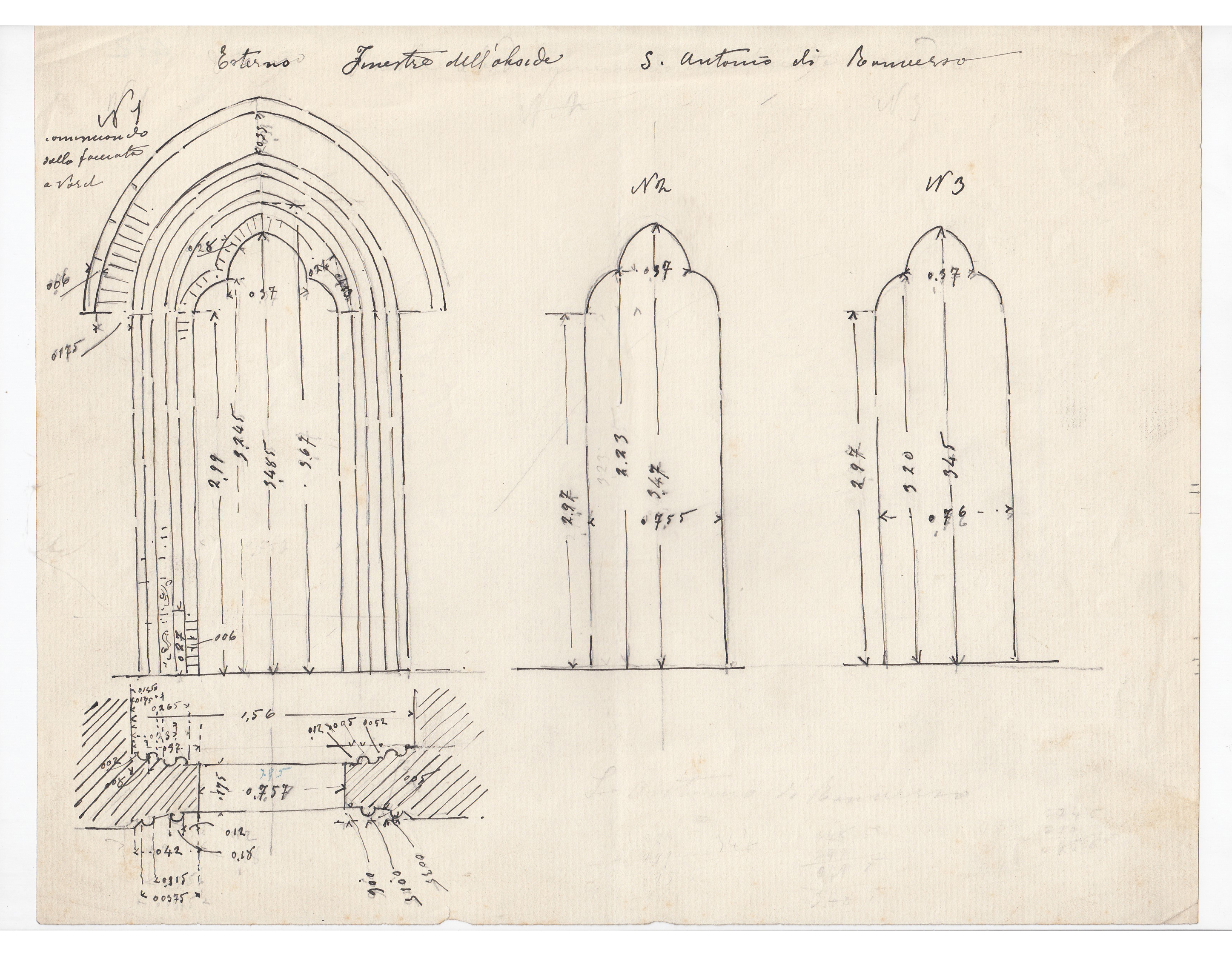 Abbazia di S. Antonio di Ranverso a Buttigliera Alta (TO)/ abside/ esterno/ facciata/ prospetto e sezione orizzontale, S. Antonio di Ranverso. Esterno. Finestra dell'abside. N. 1 cominciando dalla facciata a Nord. N. 2. N. 3
