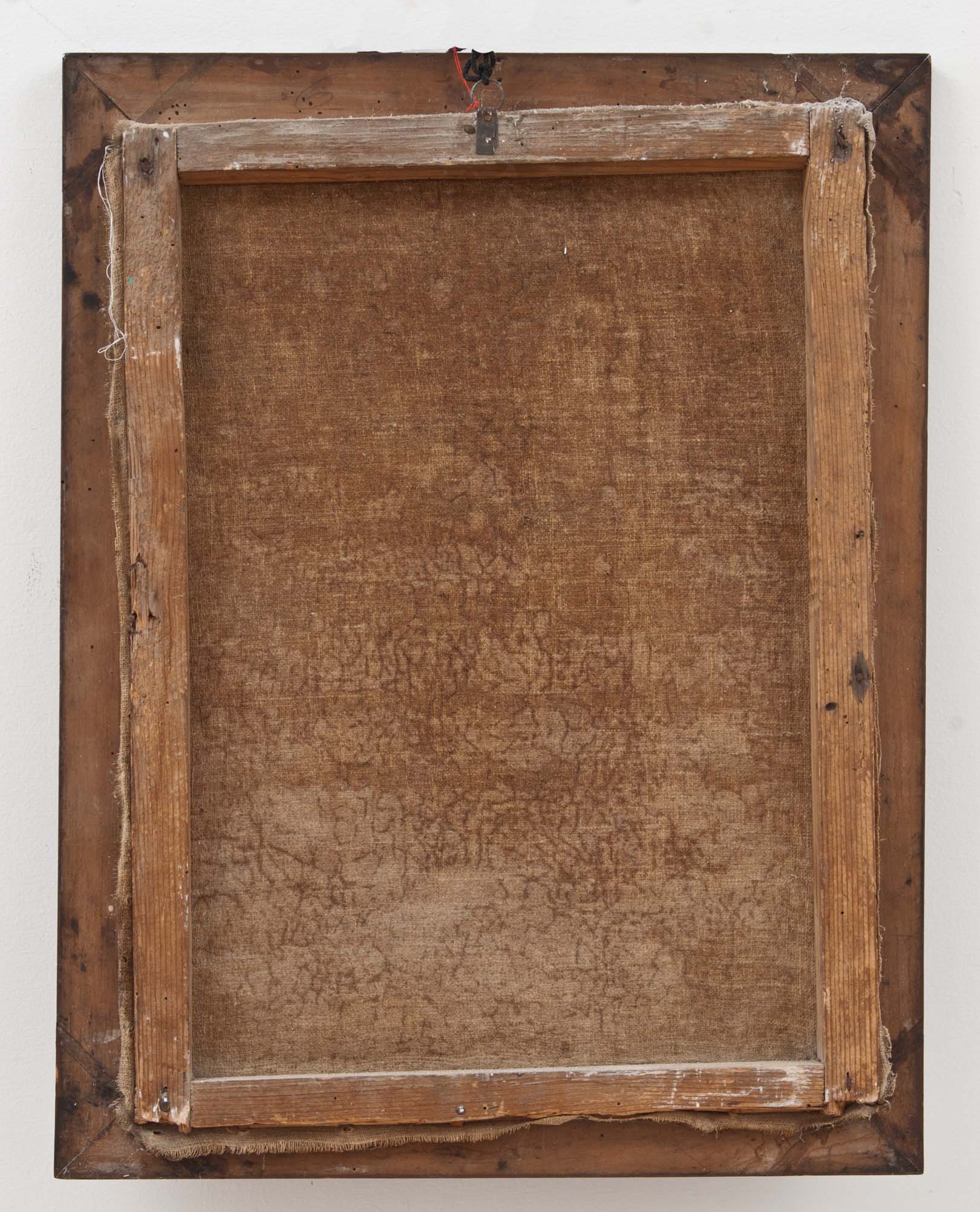 CORNICE LIGNEA cm. L 47,5 X H 62 La cornice lignea, adattata all’opera, è liscia e colorata di smalto marrone, la gola interna è dipinta con porporina.. La Madonna seduta, con la spada inflitta nel petto, porta sul grembo tra le mani la corona di spine. Lo sguardo è tristemente rivolto al cielo, sullo sfondo un paesaggio roccioso