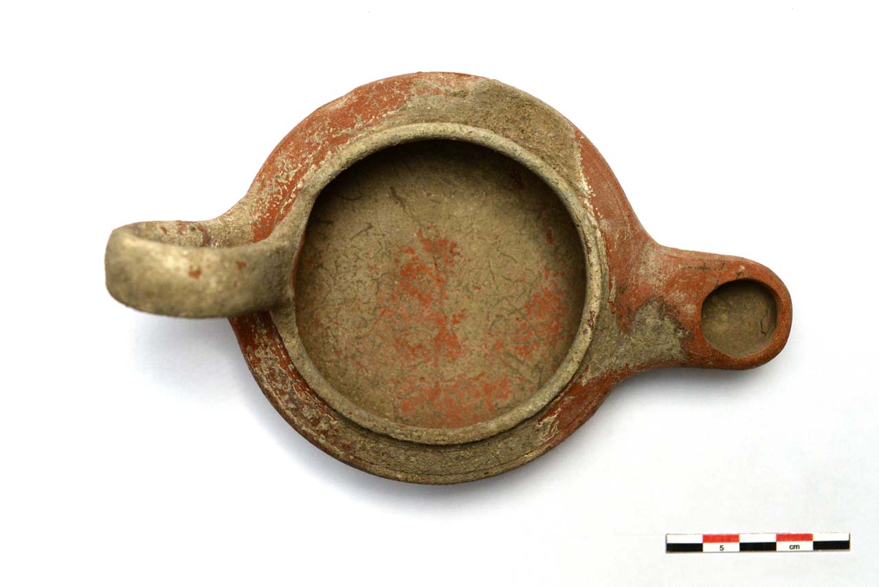 Lucerna monolicne acroma con fianchi svasati verso l'alto e molto rigonfi. Un solco segna l'inizio della spalla che termina con un bordino verticale. Da esso parte la presa, proiettata fortemente verso l'alto e ricongiunta alla lucerna all'altezza della spalla. Becco fortemente sporgente con un foro di bruciatura ovale. Base rotonda leggermente pronunciata. Corpo ceramico rosso. Amati segnala all'interno un'etichetta con scritto a penna "Etruria Arezzo", possibile indicazione di provenienza, non più presente, oltre che una seconda etichetta bianca con scritto "169". Presente etichetta bianca con "5", riferimento al catalogo di M. Amati.