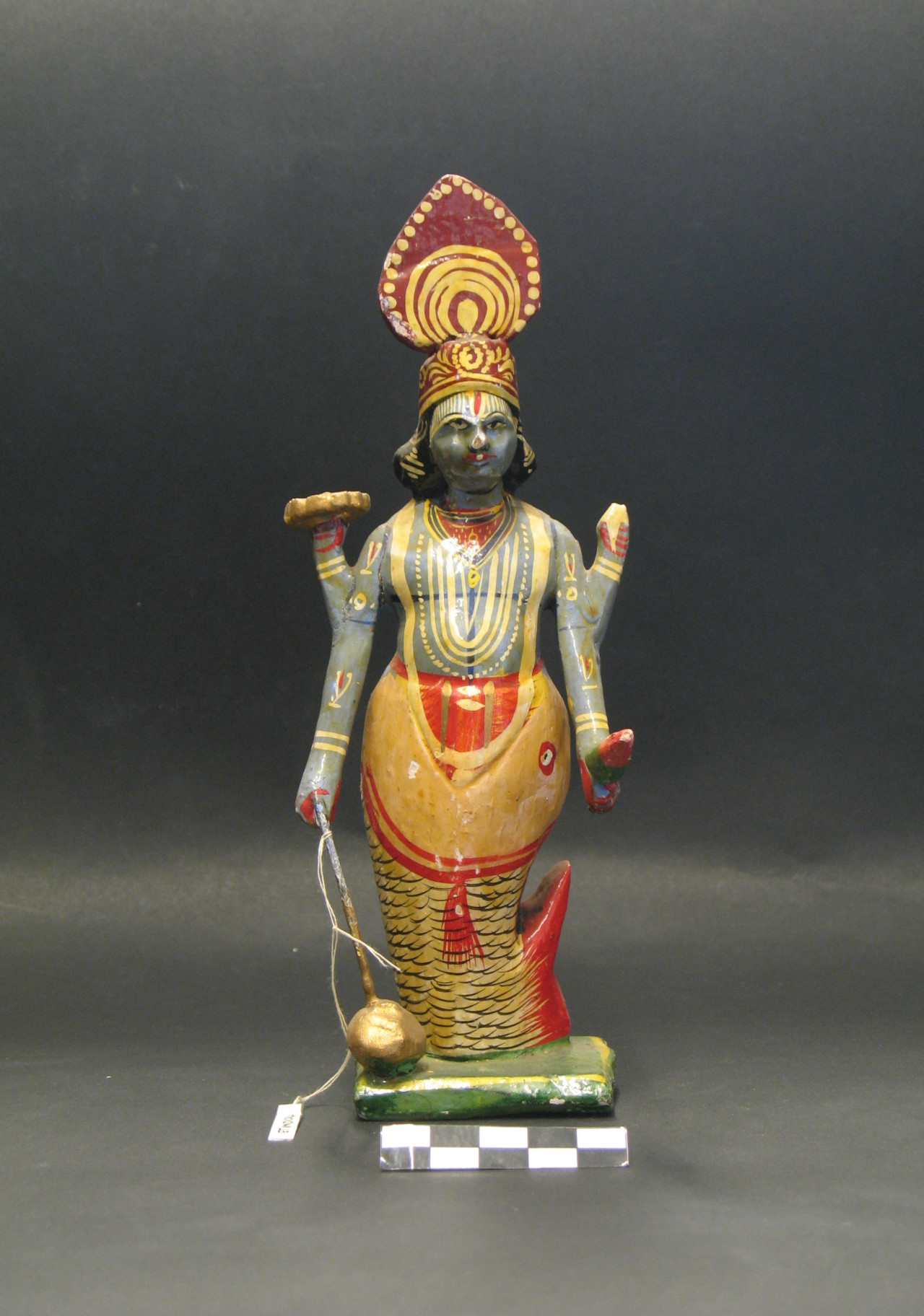 la mazza rappresenta la potenza del tempo, il disco a sei raggi (che sarebbe un fiore di loto a sei petali) l'intelligenza, la conchiglia l'origine della vita, il loto l'Universo. Vishnu, per metà pesce, tiene una mazza nella mano destra abbassata, un disco con sei raggi in quella alta, un fiore di loto nella mano sinistra bassa e una conchiglia (mancante) in quella alta. Il dio è posto su un piedistallo verde bordato di giallo, ha la pelle azzurra anziché nera e porta la corona di Benares sul capo