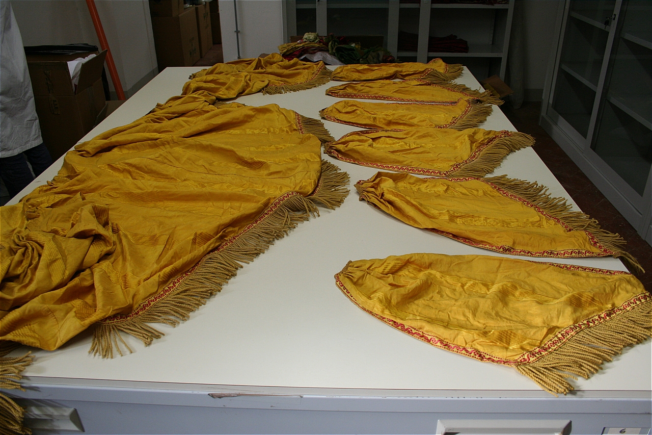 Drapperia in 7 pezzi in tessuto unito in seta gialla. Bordura in tessuto operato in seta, fondo giallo e opera rossa. Frangia in lana gialla. n.p