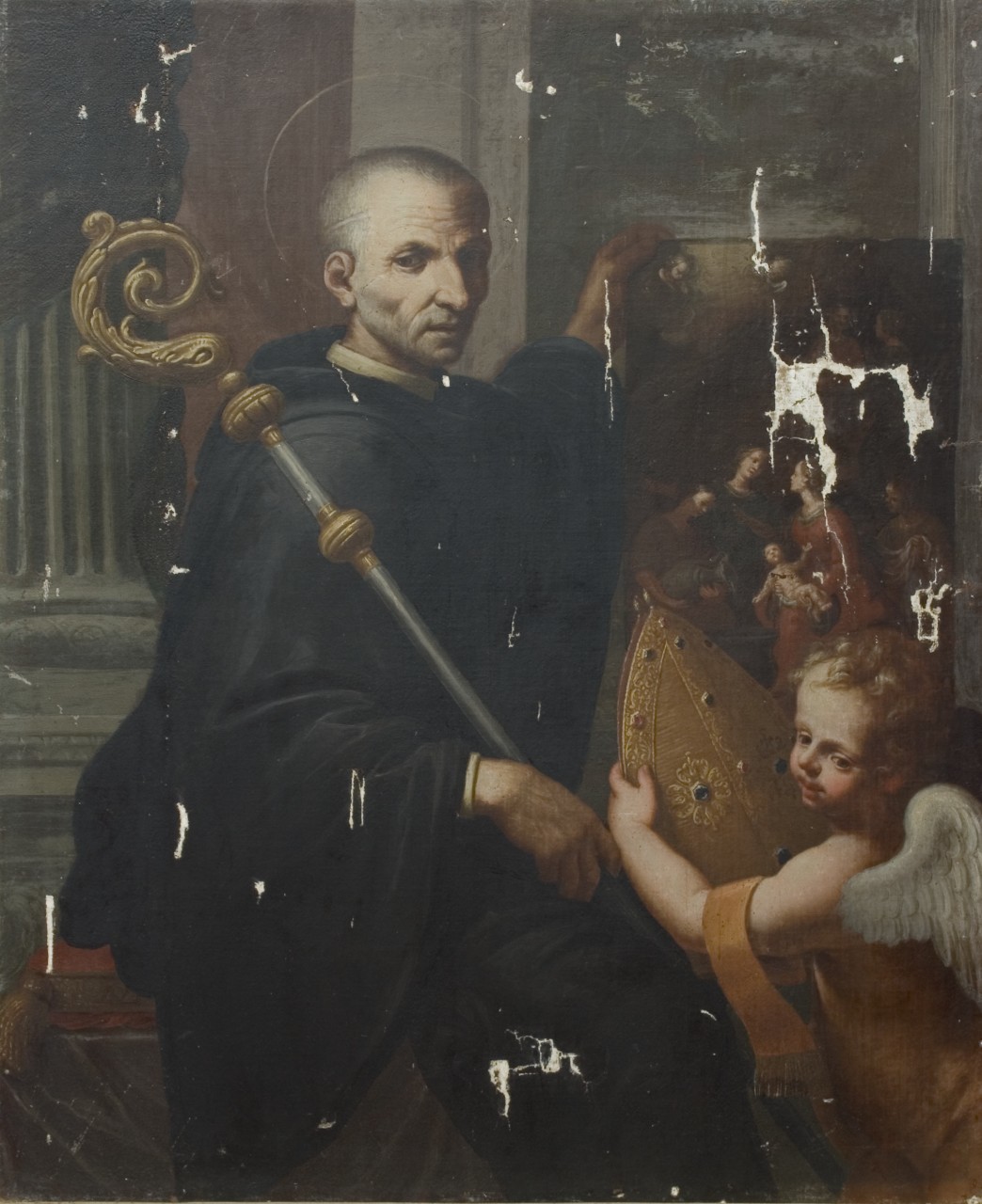 n.p.. Ecclesiastici: Santo Vescovo. Attributi: (Santo Vescovo) mitra; pastorale. Figure: angelo. Oggetti: quadro; libro. Interno. Elementi architettonici: colonna