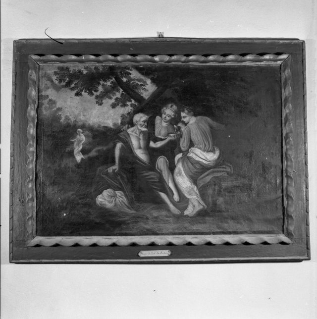 Al centro di un paesaggio cupo dai colori rossastri è rapresentato Lot seduto ed avvolto in una veste rossa e verde che lascia scoperti il torace ed il ventre. Tiene nella mano sinistra una ciotola nella quale versa del vino con una brocca una delle sue figlie. Entrambe compaiono accanto a lui coperte di ampi panneggi verdi, rossi e bianchi e con i capelli legati da un diadema. Sullo sfondo appare la figura della moglie trasformata in statua di sale, come narra il libro della Genesi. La cornice si compone di due parti intagliate e dorate: quella esterna formata da lunghe foglie stilizzate, quella interna da una decorazione sinuoseggiante che forma piccole nicchie. Tra le due parti una superficie liscia dipinta di marrone.. Personaggi: Lot. Figure: donne