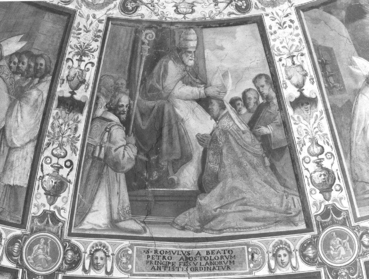 n.p.. Soggetti sacri. Personaggi: San Romolo; San Pietro apostolo. Figure maschili: astanti; sacerdoti. Abbigliamento: contemporaneo. Architetture: edificio. Oggetti: pastorale; libro; tiara; mitria; trono
