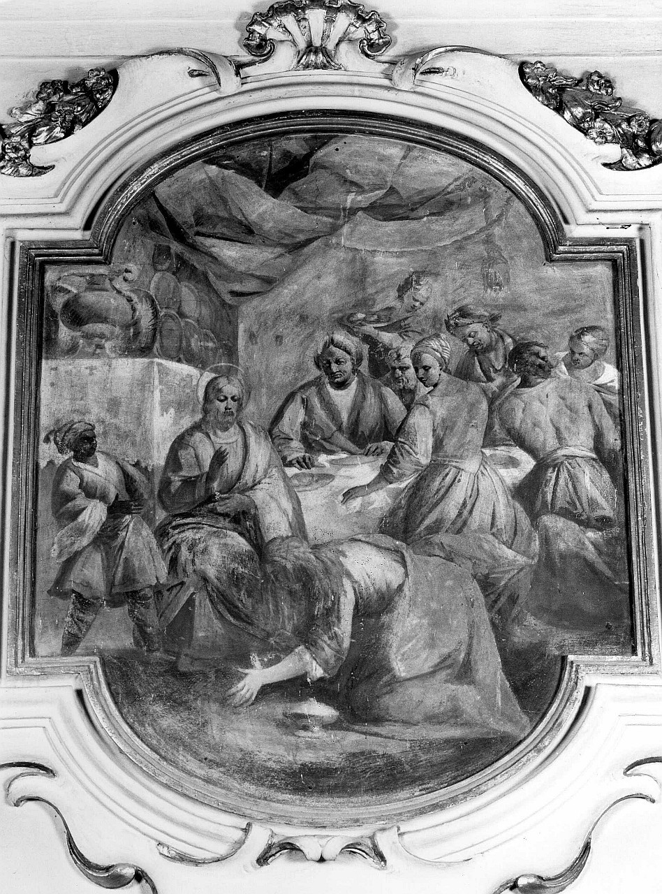 entro una cornice in stucco dorato con motivi vegetali lungo quasi tutto il suo perimetro vediamo inginocchiata in primo piano la Maddalena nell'atto di ungere i piedi a Gesù mentre i commensali osservano la scena seduti alla tavola che, posta in prospettiva, suggerisce senso di profondità. Alle spalle di Gesù un tendaggio e un'alta credenza su cui sono in mostra piatti e una brocca che completa la spazialità della scena. I colori sono tenui. Soggetti sacri. Personaggi: Cristo; Maddalena. Figure: commensali. Oggetti: ampolla; brocca; tavola; piatti; credenza; drappo. Vedute: interno