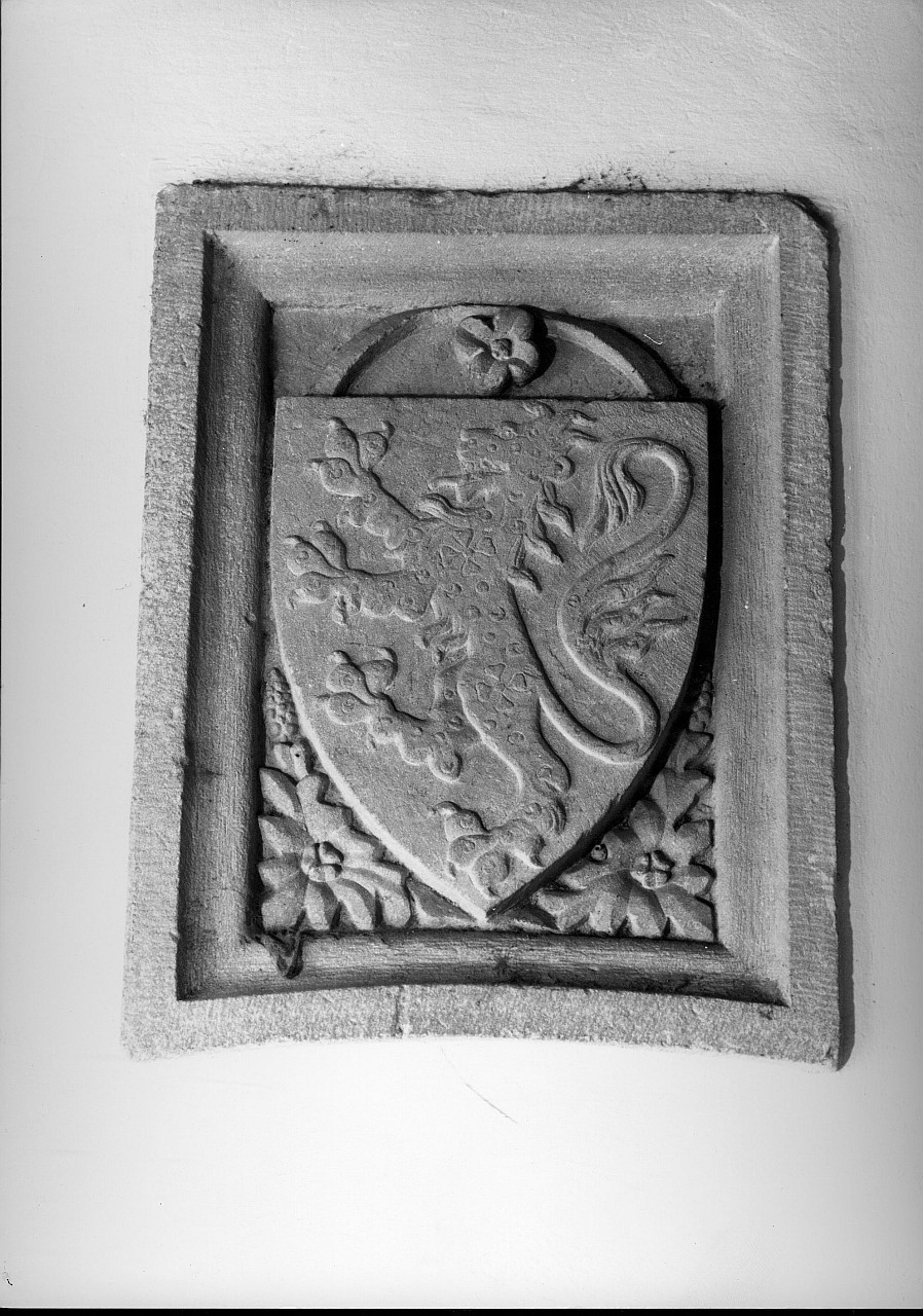 Stemma con cornice gradinata e scudo al centro. Nella parte inferiore, tra lo scudo e la cornice, sono due corolle con petali appuntiti.. n.p