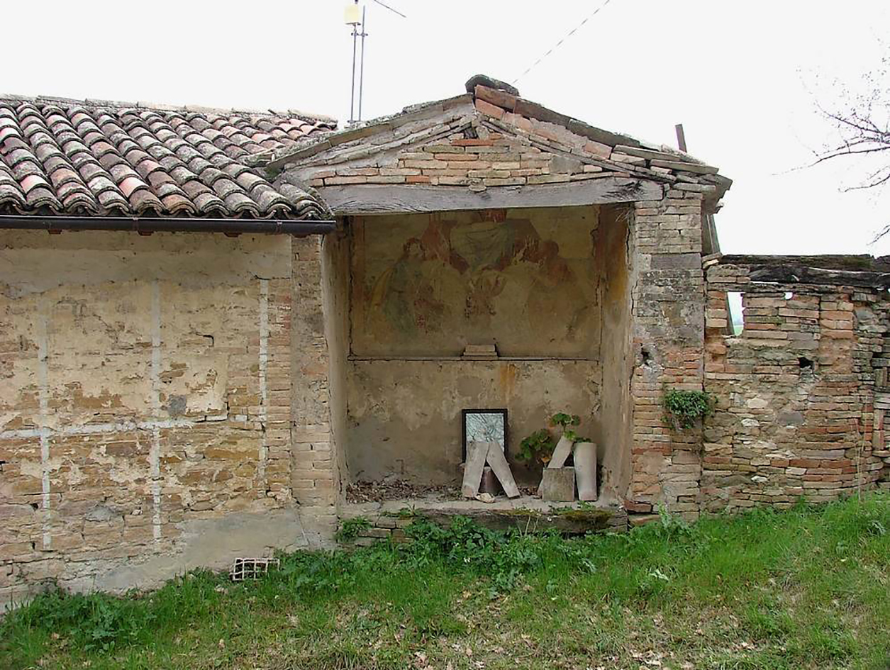 Piccolo vano, architravato con trave in legno a vista, in muratura di mattoni e copertura a travetti di legno e pianelle di laterizio, inglobato nella parete laterale di una casa colonica