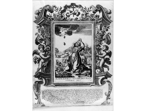 Soggetti profani. Personaggi: frate Bonaventura di tre quarti in ginocchio con le mani giunte sopra la testa. Fenomeni divini: direttamente dal cielo cadono forme di pane che riempiono un sacco vicino al frate. Decorazioni: sullo sfondo scene della vita del frate; cornice decorativa con putti motivi architettonici e floreali