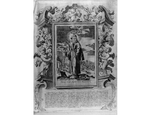 Soggetti sacri. Personaggi: San Adiuto. Attributi: (San Adiuto) palma del martirio; spada. Decorazioni: sullo sfondo momenti della sua vita come missionario in Marocco; cornice decorativa con putti motivi architettonici e floreali