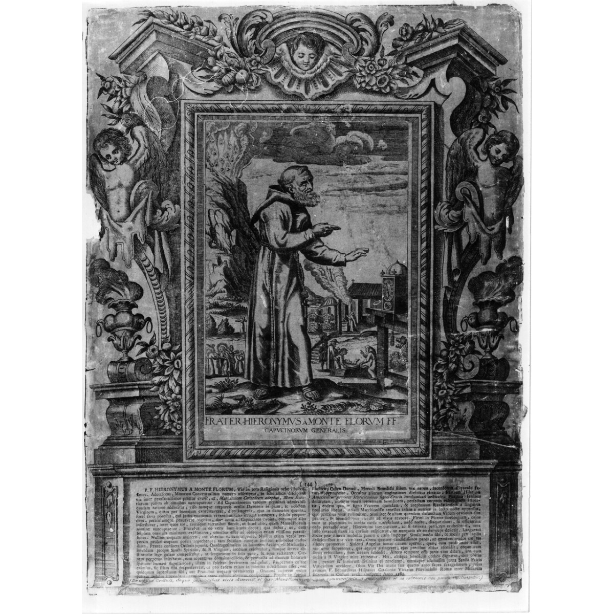 Soggetti profani. Personaggi: frate Girolamo. Oggetti: orologio. Paesaggi: sullo sfondo altri episodi della vita del frate. Decorazioni: cornice decorativa con putti motivi architettonici e floreali