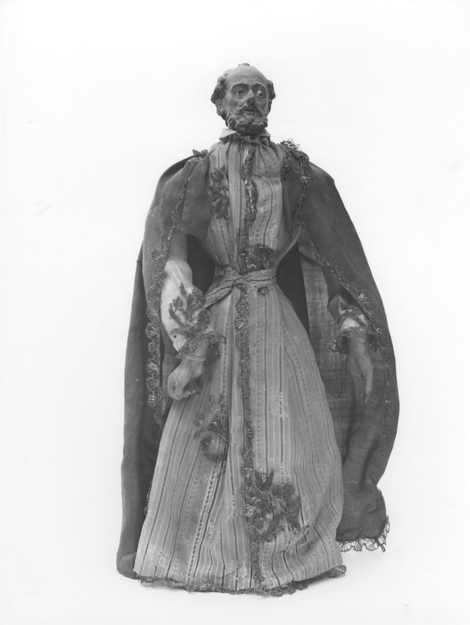 Statuetta in legno policromo con arti superiori in cartapesta staccati dal busto. Tunica di stoffa con cintura e lungo mantello.. Soggetti sacri. Personaggi: San Giuseppe