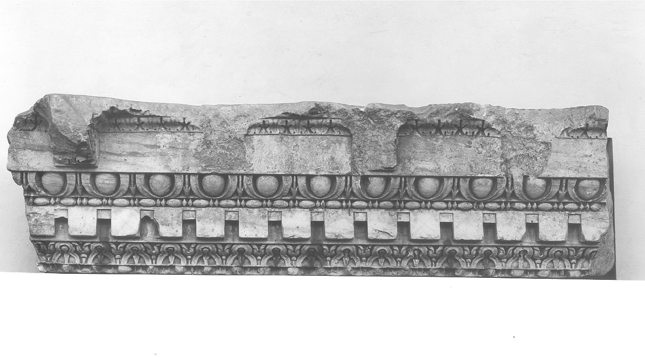 Blocco di cornice rettilinea angolare. Dall'alto: parte di mensole di forma rettangolare allungata a doppia voluta terminante a rocchetto, decorate nella parte inferiore da una foglia d’acanto con listello alla base; profila le mensole ed i tre lati del cassettone una modanatura a gola rovesciata ornata da fogliette frastagliate alternate a fogliette di acqua; il fondo su cui sono impostate le mensole è liscio; ovoli entro largo guscio con nastro a sezione curva, elemento di separazione a punta di freccia; astragalo con perline allungate e fusarole a disco a disco biconvesso rigonfio; dentelli di forma pressoché quadrata, collegati da listello ribassato; Kyma di tipo B dello Strong, con elemento arcuato impostato largamente, fiore caliciforme a tulipano pendenti a punta di lancia; astragalo come il precedente. Sul fianco l’astragalo terminale non è completato; soluzioni angolari: mezzo ovolo per parte, così pure i dentelli e per l’astragalo; nel Kyma foglietta d’acanto. Facciata posteriore grezza; sul piano inferiore, levigato, quattro piccoli fori quadrati di sollevamento agli angoli; sul piano superiore due fori per grappe a coda di rondine e tre fori quadrati con canalicolo di scolo per fissare perni; tacche di accostamento lungo la linea di fede.