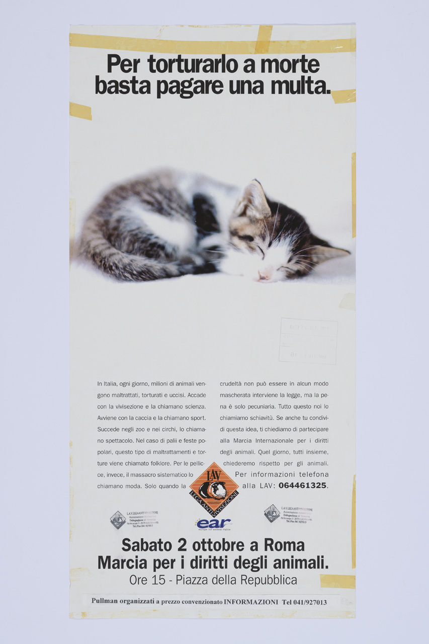 Lettura iconografica: animali; gatto. Categoria merceologica/ tipo evento: organizzazioni associative; associazioni animaliste. Nomi: Lav; Lega Antivivisezione. Luoghi: Roma