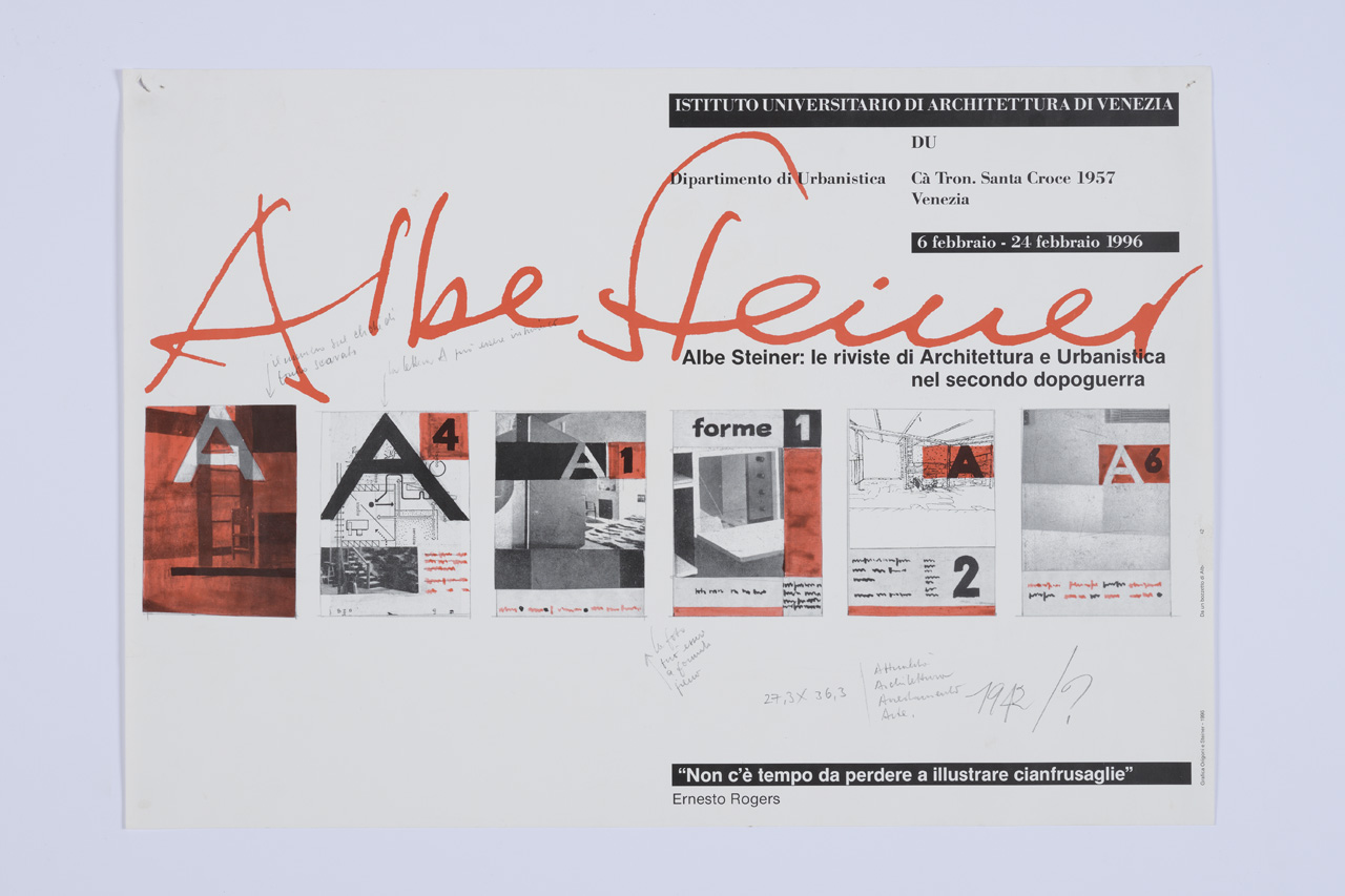 Lettura iconografica: riviste; giornali. Categoria merceologica/ tipo evento: manifestazioni culturali; mostre; mostre d'arte; architettura. Nomi: Albe Steiner; Ca' Tron. Luoghi: Venezia