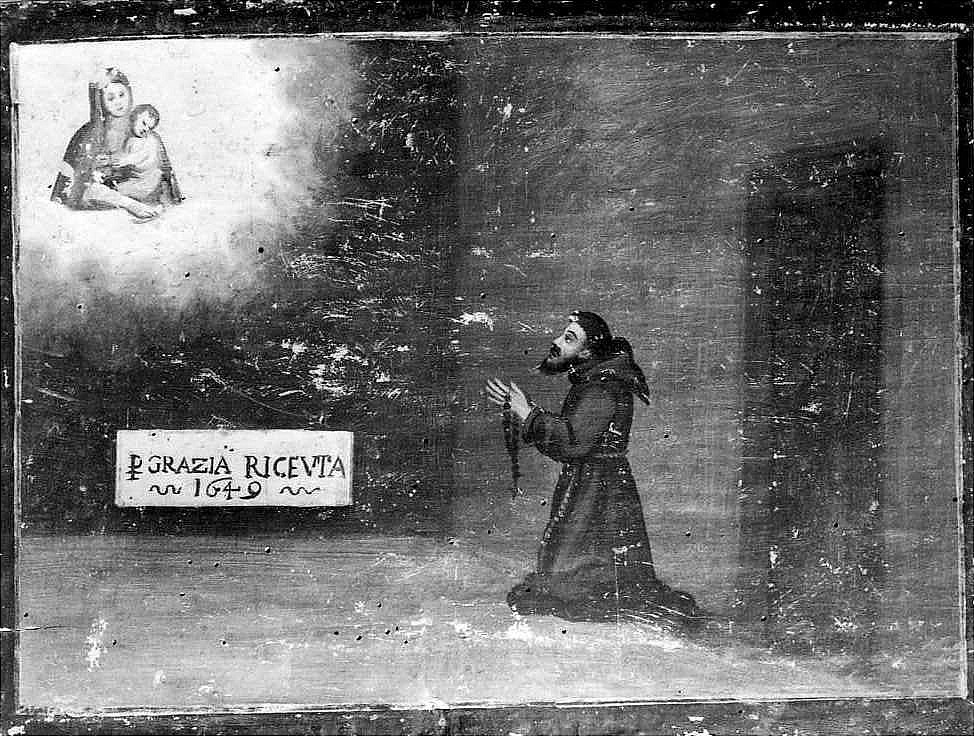 tavola con bordo dipinto.. Personaggi: Madonna; Gesù Bambino. Figure: frate in preghiera. Oggetti: rosario. Abbigliamento: all'antica; saio francescano