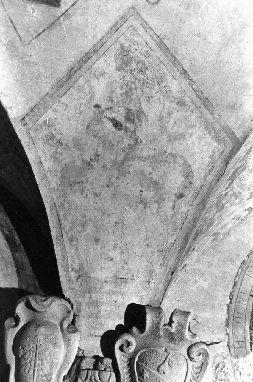 La consunzione ha reso pressochè illeggibile questa raffigurazione, dipinta in un pennacchio della volta dell'atrio, comprendente con molta probabilità uno stemma con un'iscrizione.. Araldica