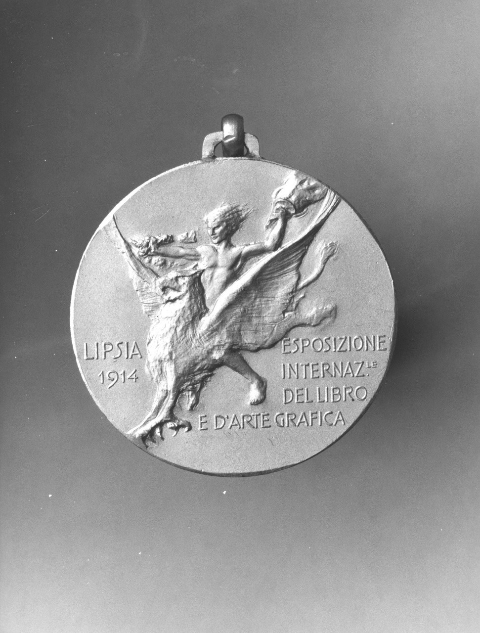Medaglia celebrativa per la partecipazione italiana all'Esposizione del Libro.. Araldica: (verso) stemma Sabaudo. Allegorie-simboli: (recto) Italia. Animali fantastici: (recto) leone-aquila. Oggetti: (recto) fiaccola; alloro