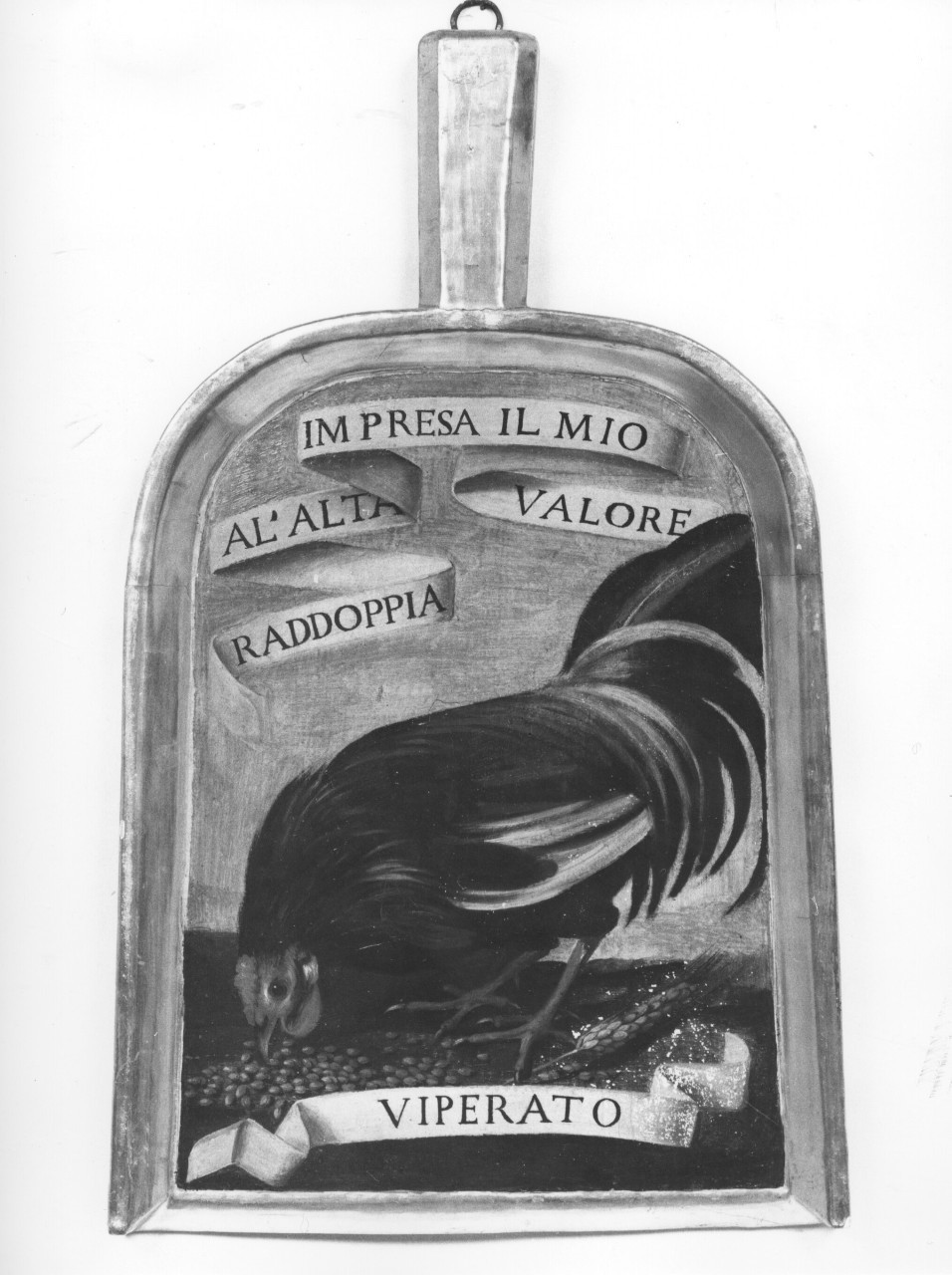 Dipinto in forma di paletta da farina.. Soggetti profani. Piante: grano. Animali: cappone; vipera