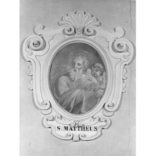 Dipinto inserito entro un'elaborata cornice in stucco a riccioli con cartiglio alla base.. Personaggi: San Matteo Evangelista. Attributi: (San Matteo Evangelista) angelo; libro. Abbigliamento: tunica; mantello. Oggetti: penna. Decorazioni: conchiglia