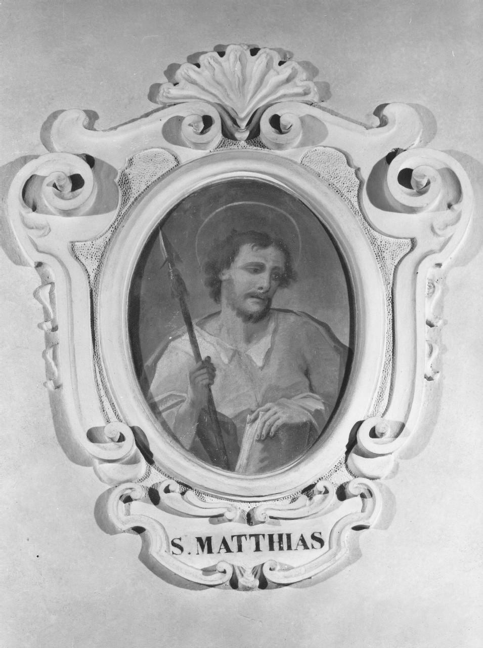 Dipinto inserito entro un'elaborata cornice in stucco a riccioli con cartiglio alla base.. Personaggi: San Mattia apostolo. Attributi: (San Mattia Apostolo) lancia. Abbigliamento: tunica; mantello. Oggetti: libro. Armi: lancia. Decorazioni: conchiglia
