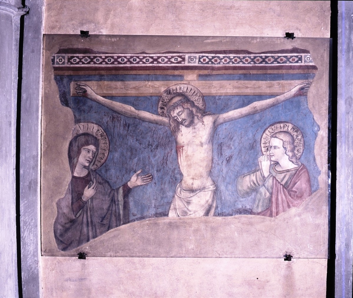 crocifissione di Cristo con la Madonna, San Giovanni Evangelista (dipinto murale staccato, frammento)