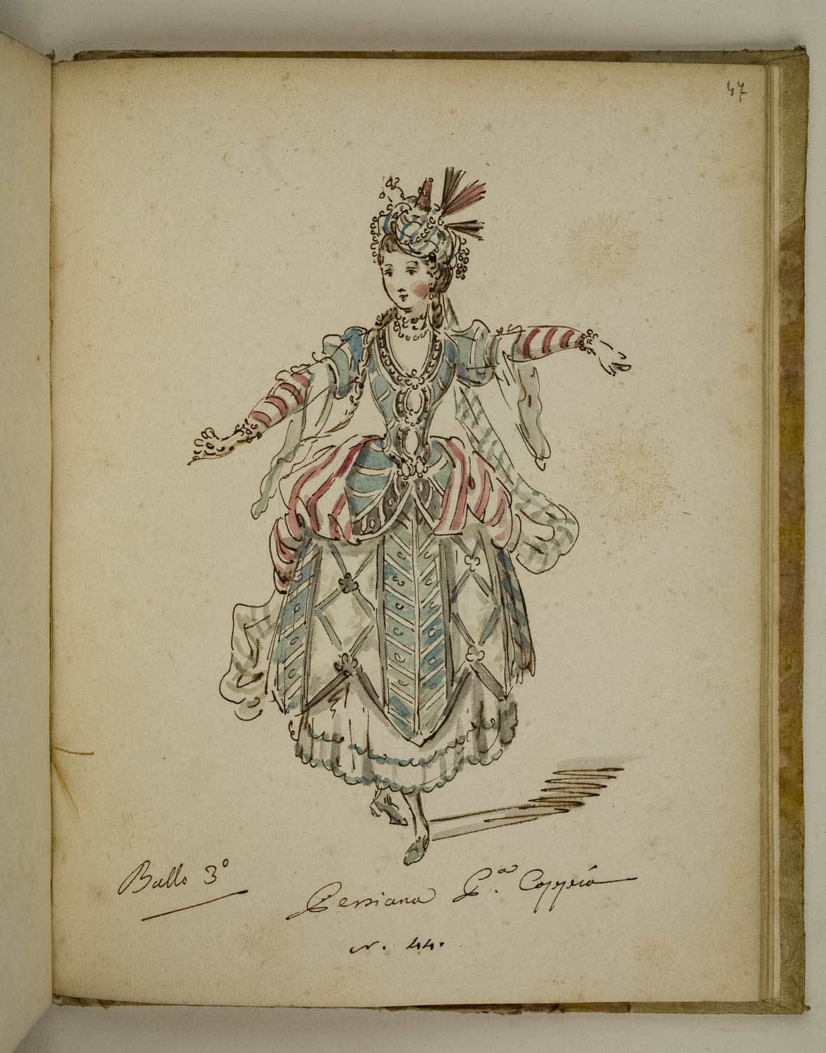 Disegno a inchiostro acquerellato di figurino di costume teatrale per un personaggio di "Persiano Quarta Coppia”, come da titolo. La figura, in passo di danza, indossa un abito composto di una gonna bianca e azzurra, un corpetto azzurro a righe bianche con maniche a righe bianche e rosse, una collana di perle, un copricapo persiano con perle e piume e un paio di scarpette azzurre.. FIGURE: giovane donna persiana; ballerina. ABBIGLIAMENTO: gonna; corpetto; collana di perle; copricapo persiano con perle e piume; scarpette