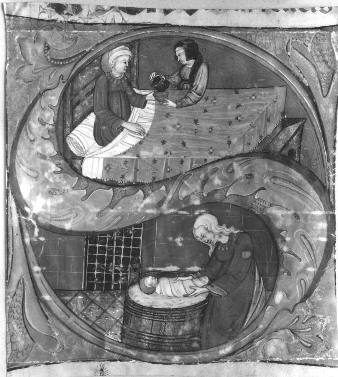 Due scene distinte si dispongono entro l'iniziale S di color viola marezzato: in alto un'assistente versa una bevanda a Sant'Anna a letto coperta da una coltre turchina; sotto forse la stessa Sant'Anna (a quanto è dato desumere dalla collana) fa il bagno alla Vergine neonata in un ambiente caratterizzato da una grande inferriata. La iniziale è racchiusa entro quattro angoli a fondo oro e volute di fogliami verdi e turchine. Sul verso è una annotazione musicale.. Personaggi: Sant'Amma; Maria Vergine. Interno. Mobilia: letto; fasciatoio