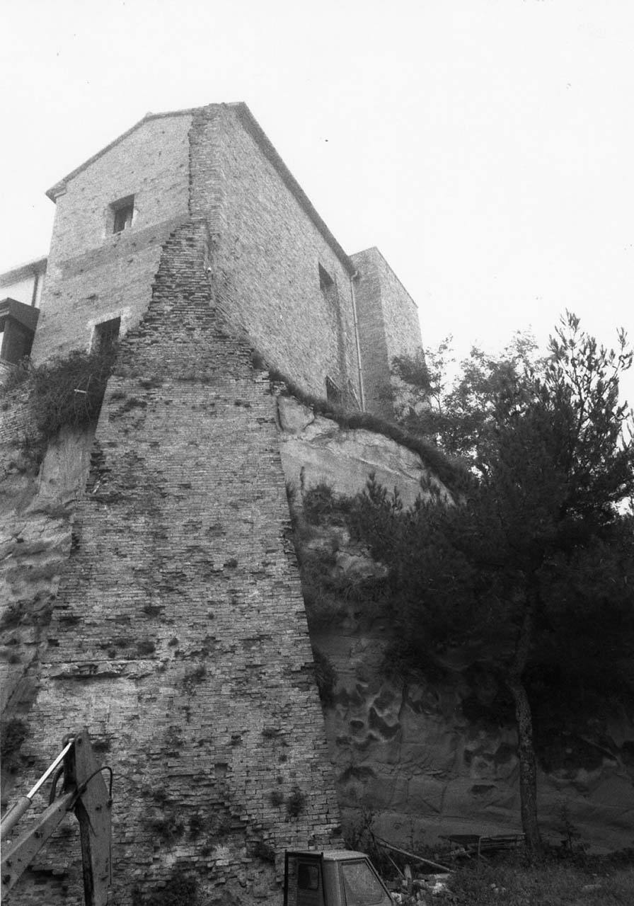 strutture verticali: parete (in muratura a corsi regolari, laterizio), intero bene; strutture di orizzontamento: volta; solaio (a botte a sesto ribassato intera struttura; intera struttura muratura; travi lignee), torre; corpo residuo; coperture: piana; a tetto (a falde intera struttura travatura su muri ; intera struttura travatura su muri ), torre; corpo residuo; scale: principale; scala (scala; di servizio a due rampe; ad una rampa, su muri; travi, legno/ laterizio; legno), interna; interna