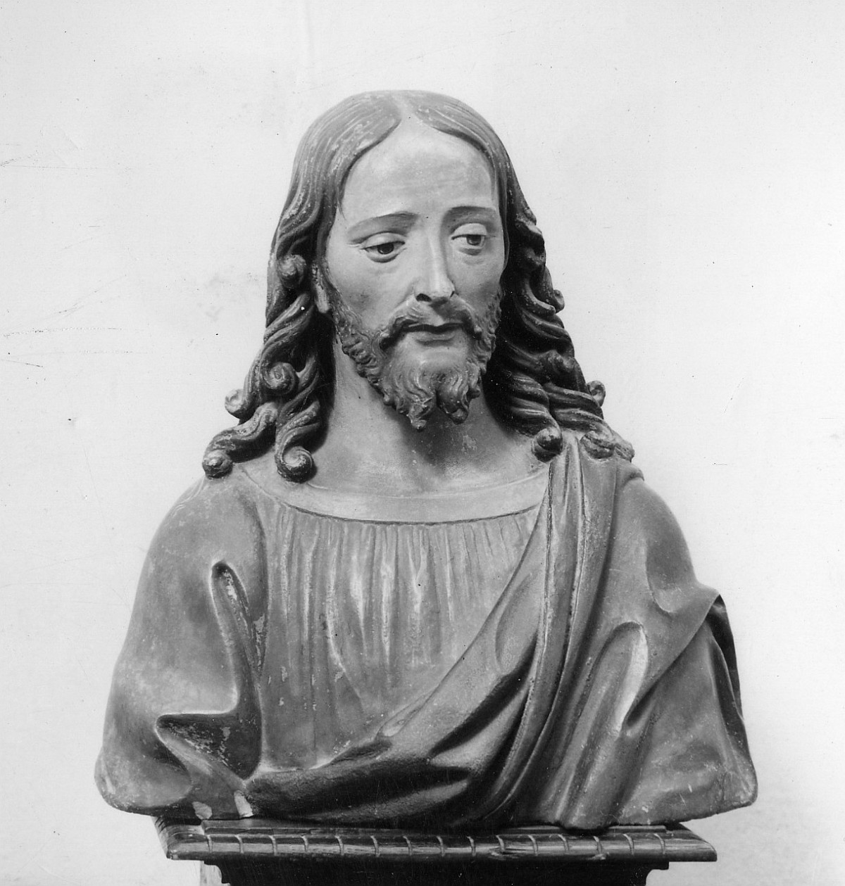 Busto a tutto tondo di grandezza inferiore al vero.. Soggetti sacri. Personaggi: Cristo Salvatore; frontale; sguardo assorto; bocca socchiusa; chioma ondulata ricadente in grosse ciocche; lunghi baffi; barba appuntita. Abbigliamento: tunica rossa orlata di avorio; manto celeste