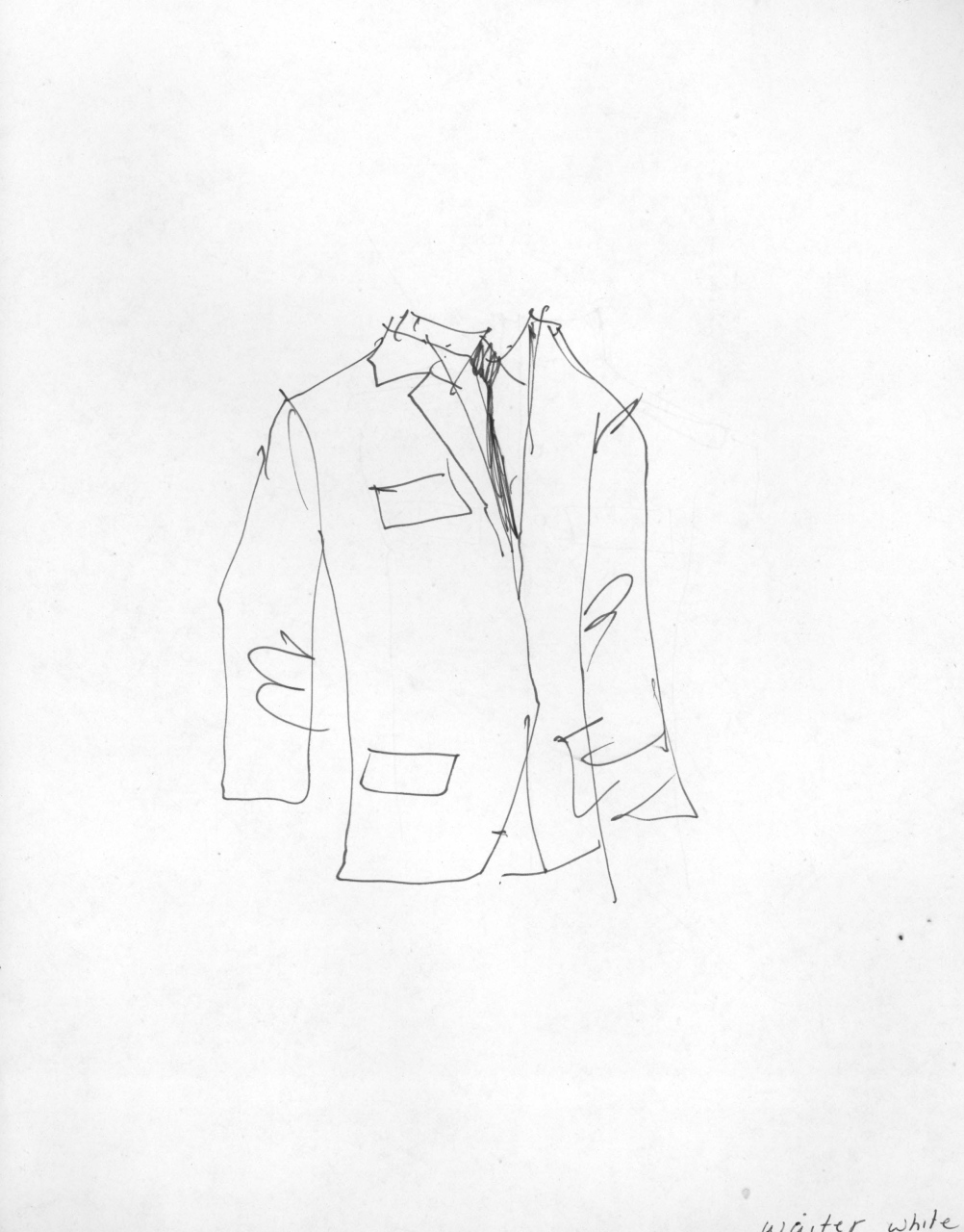 Disegno eseguito a penna su foglio di carta bianca raffigurante un costume di scena composto da giacca, camicia e cravatta. Abbigliamento: costume teatrale