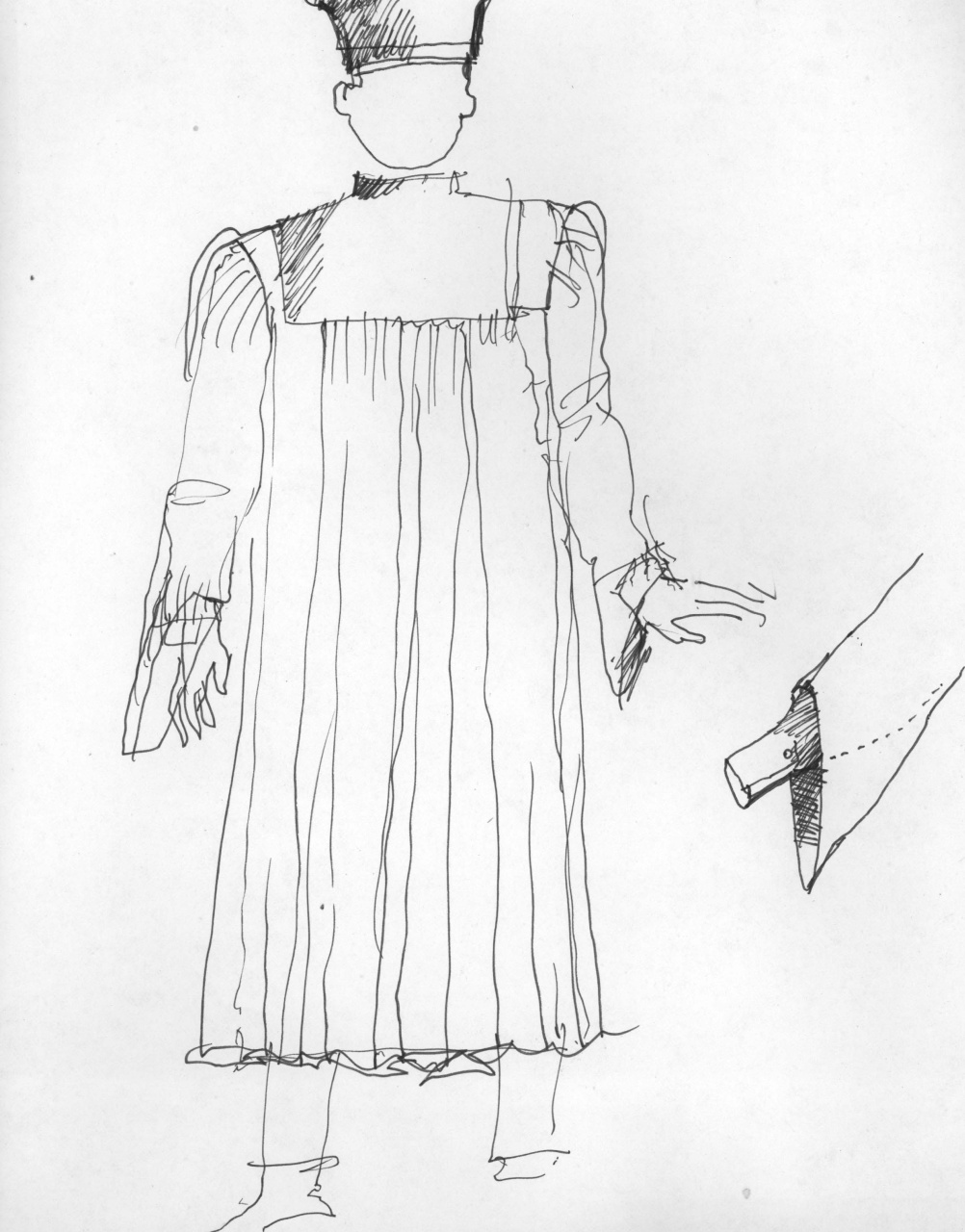 Disegno eseguito a penna su foglio di carta bianca. Figurino per costume di scena maschile composto da tonaca e cappello. A destra, dettaglio della manica dell’abito. Abbigliamento: costume teatrale