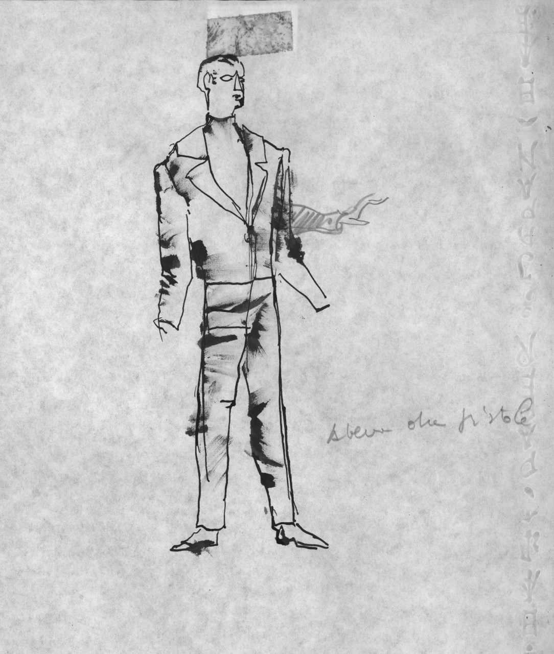 Disegno eseguito a inchiostro su foglio di carta bianca. Figurino per costume di scena, maschile, composto da maglia, giacca, pantalone e scarpe. Al centro, schizzo a matita della manica della giacca raffigurata in un'altra posizione. Figure umane. Abbigliamento: costume teatrale