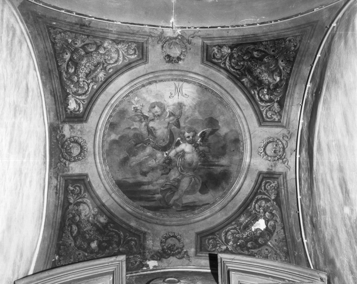 n.p.. Soggetti sacri. Figure: angioletto che tiene nella mani destra uno stelo di gigli e indica con l'altra mano il simbolo mariano nel cielo; angioletto recante rose e altri fiori. Abbigliamento: panneggi rossi. Decorazioni: incorniciatura di bacche e foglie di alloro; arabeschi a grottesca con elementi vegetali e bracieri fiammeggianti dorati sul fondo vinaccia e disporti agli angoli entro cornici sagomate alternati da corone floreali formate da nastri svolazzanti