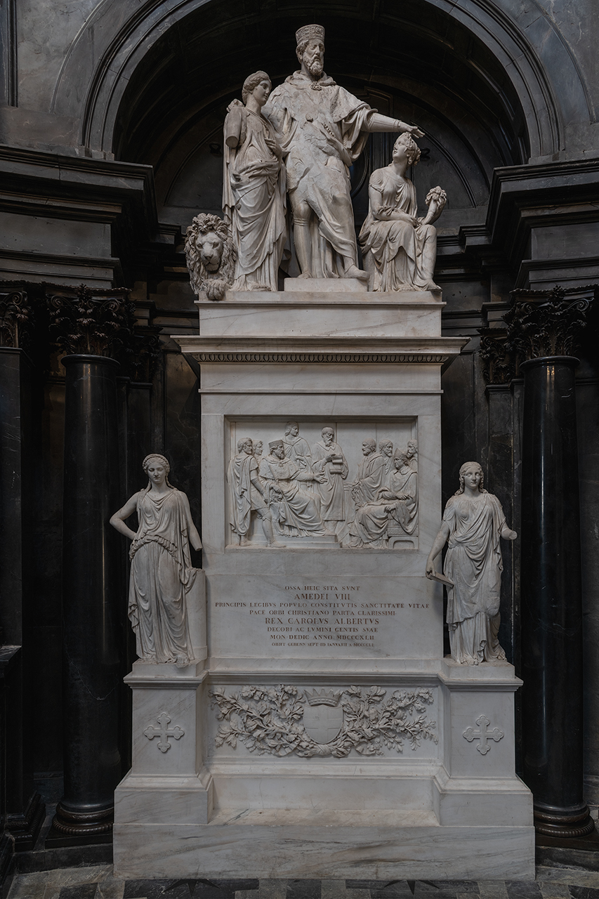Monumento funebre in marmo alla memoria del duca di Savoia Amedeo VIII posto al centro del semiciclo a nord. Comprende, oltre alla raffigurazione del duca, quattro figure allegoriche rappresentanti la Giustizia, la Fermezza, la Sapienza e la Felicità. Al centro del basamento superiore compare un bassorilievo recante Amedeo VIII intento a pubblicare la sue leggi, con accanto il figlio Ludoviso, erede del ducato, e il vescovo di Chambery.. PERSONAGGI: AMEDEO VIII DUCA DI SAVOIA