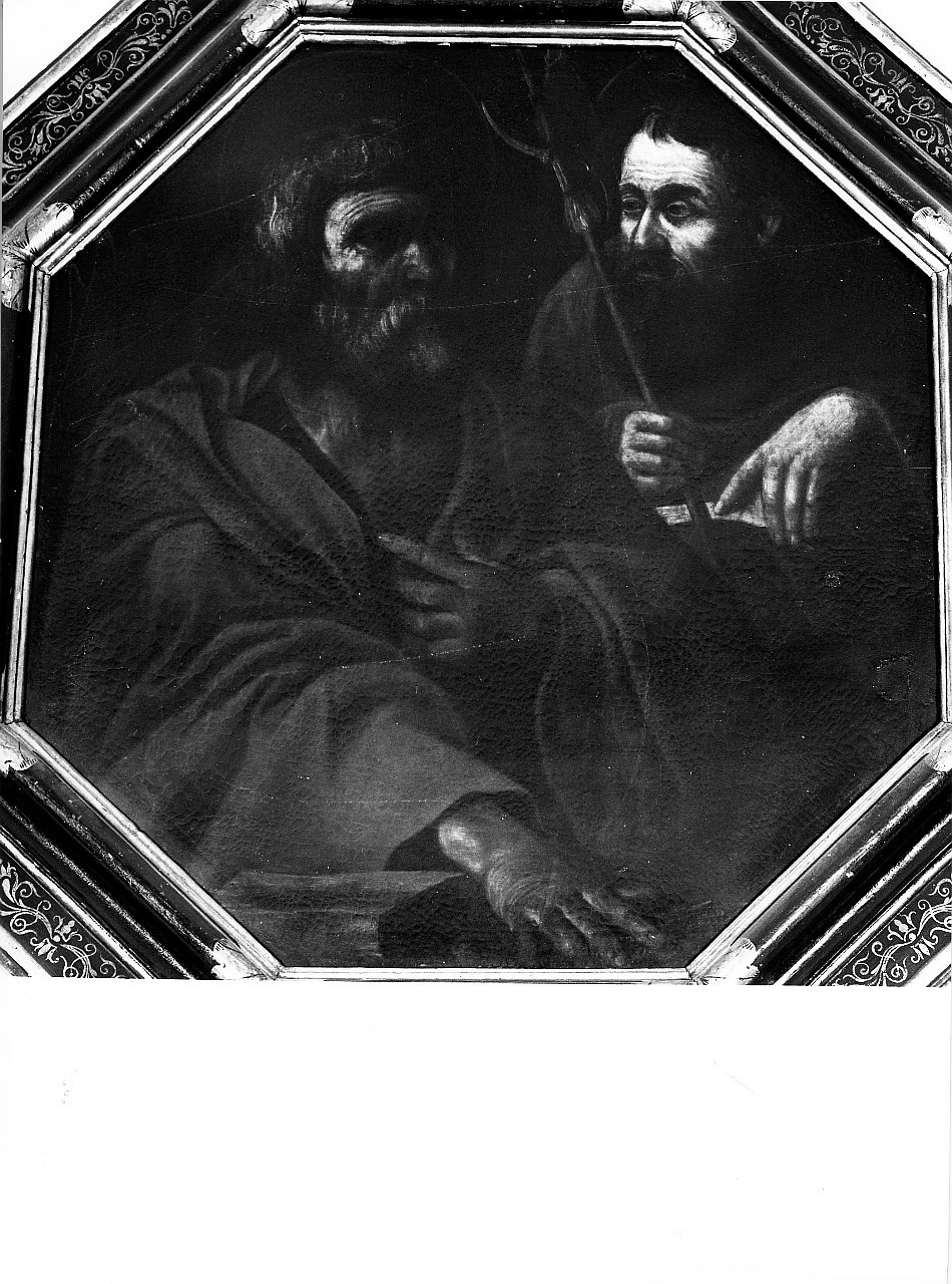 Soggetti sacri. Personaggi: San Simone Apostolo; anziano; mezzo busto; volto di tre quarti; sguardo verso l'alto; mano sinistra al petto. Abbigliamento: mantello. Personaggi: San Taddeo Apostolo; mano destra sorregge il bastone; mano sinistra appoggiata al libro. Attributi: (San Taddeo Apostolo) bastone