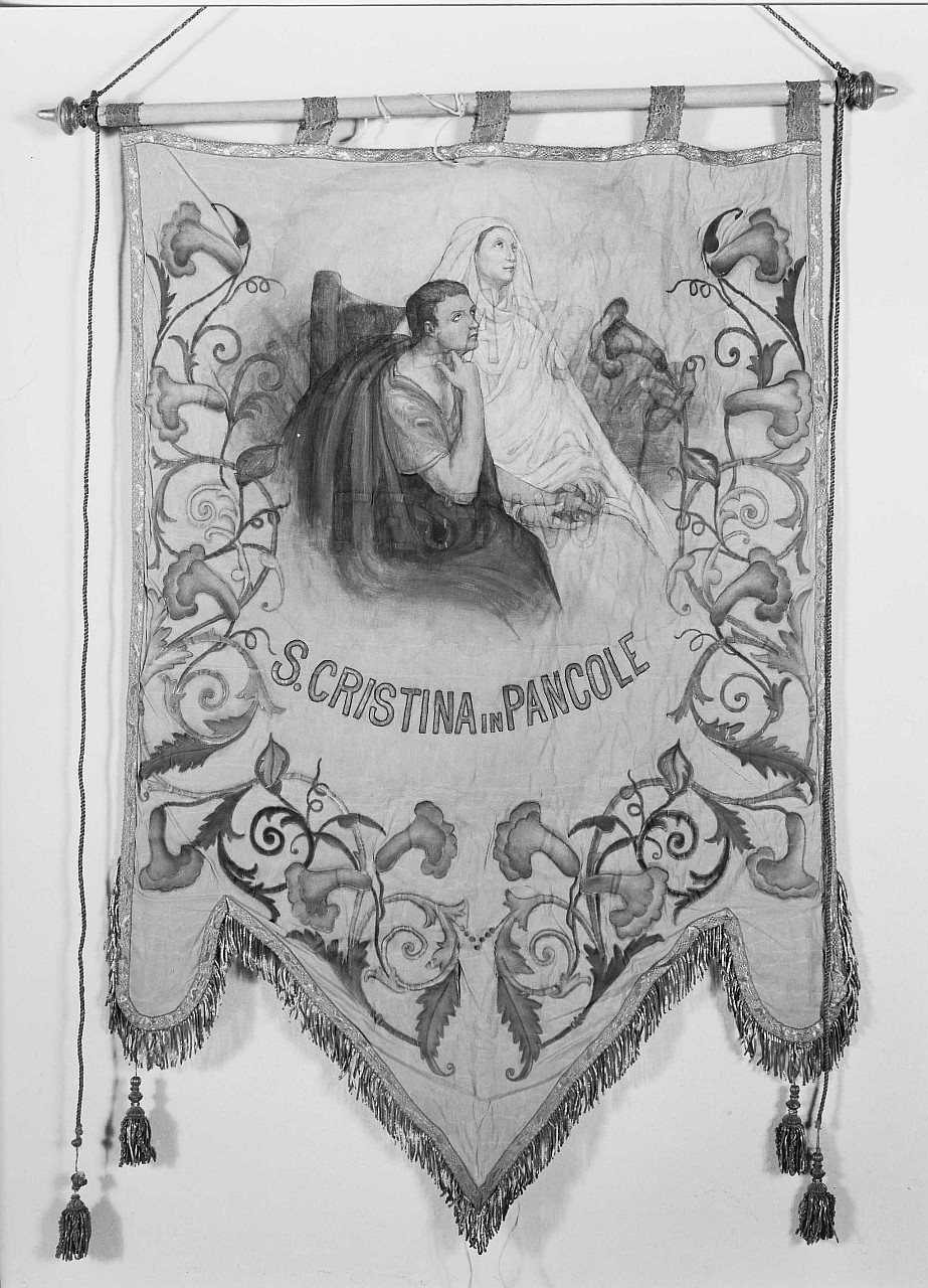 Stendardo in seta bianca dipinta a tempera con al centro le figure di Santa Cristina e Sant'Ilario (?), contornate da un ramage di fiori e volute; frange in filo metallico dorato.. n.p