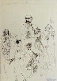 Disegno eseguito a pennarello nero su foglio di carta bianca. Al centro, grande pupazzo con mantello e genitali in mostra; a destra, un vescovo e un generale con dei bastoni; a sinistra, due donne nude e uomo con bastone in mano (personaggi teatrali appartenenti al Popolo, allo Stato e alla Chiesa). Figure umane. Oggetti: pupazzo. Personaggi: Vescovo; Generale. Nudi femminili