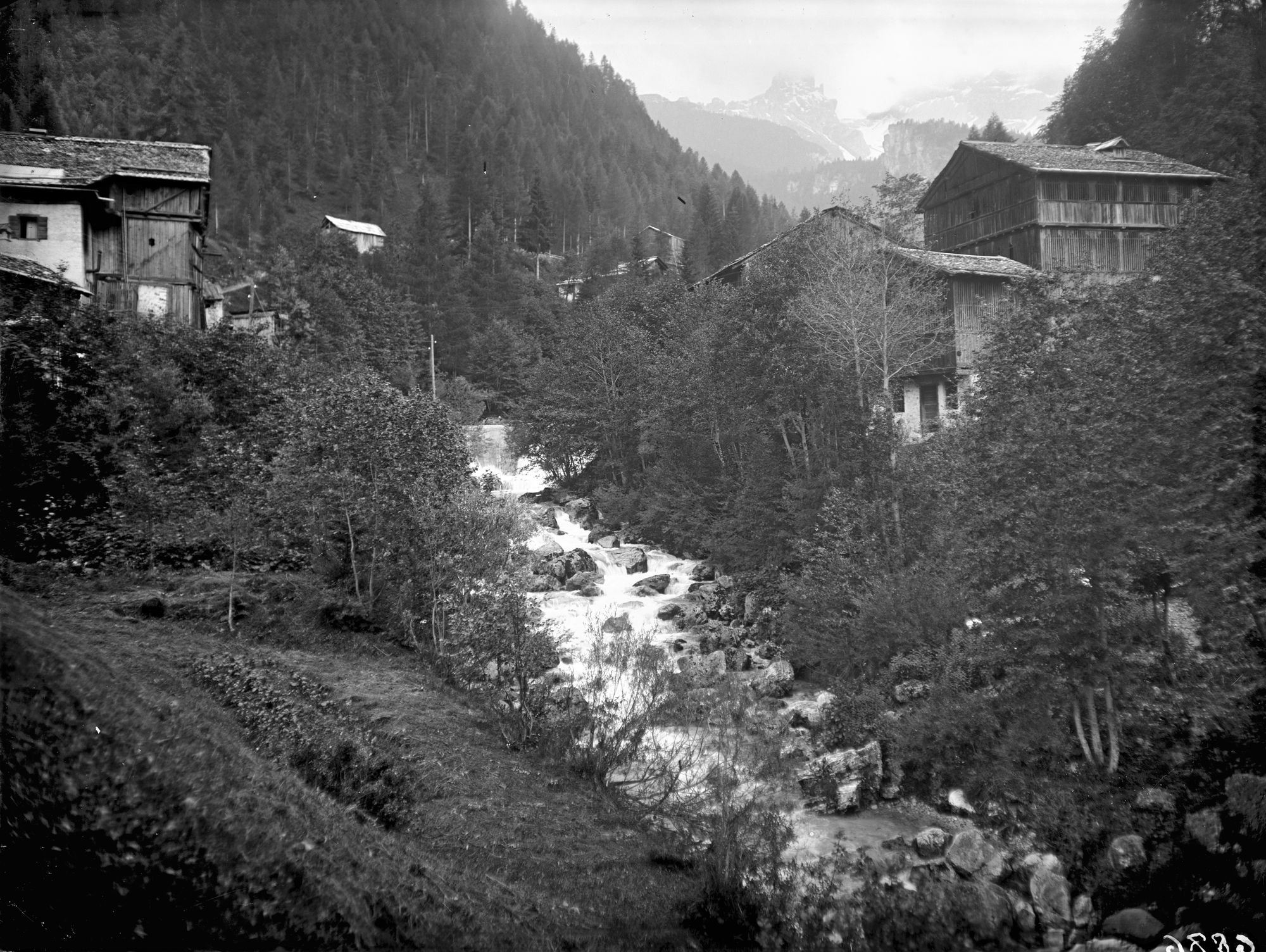 Forno di Zoldo. Paesaggio col torrente Pramper e il monte San Sebastiano. (negativo)