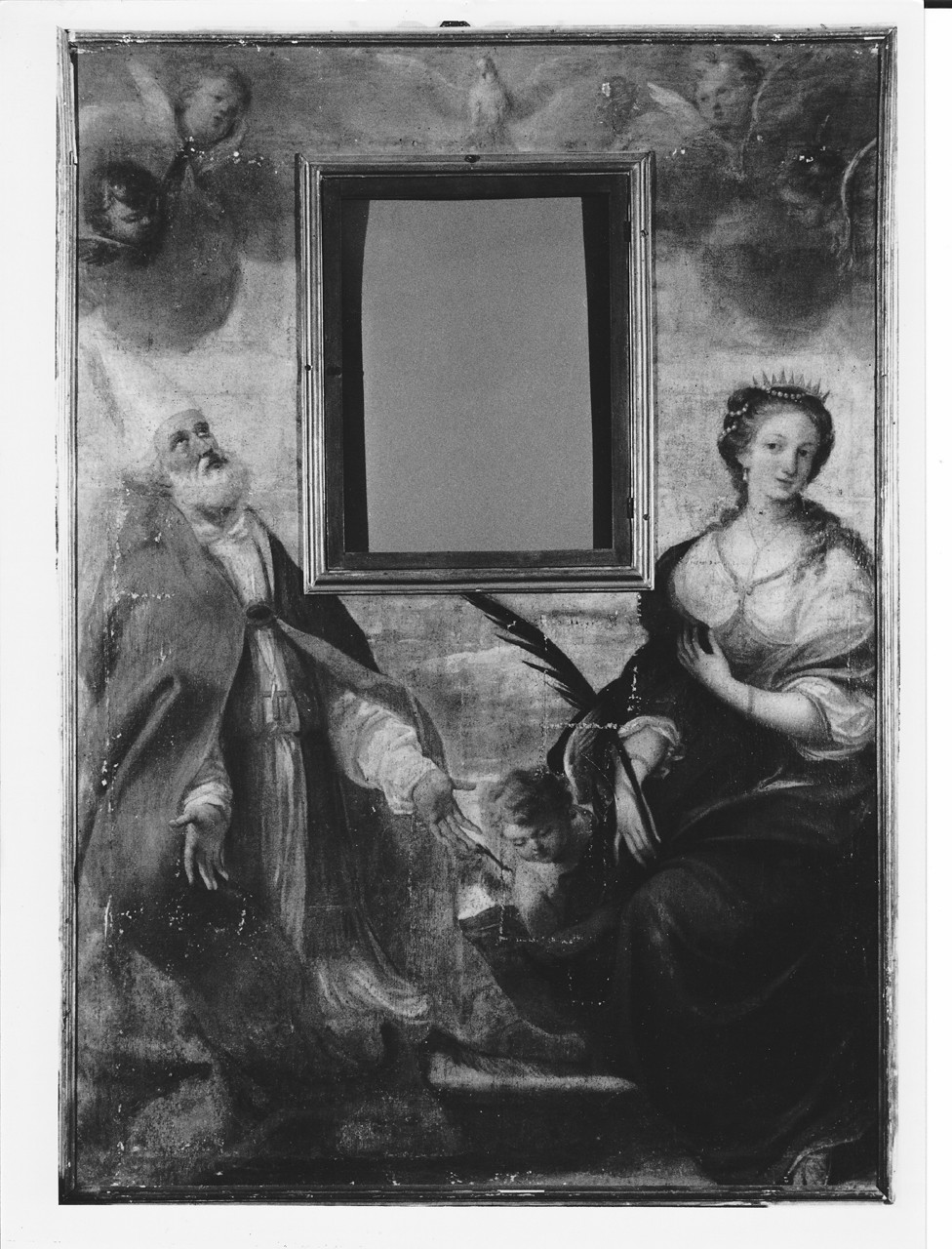 Tela rettangolare con apertura centrale.. Personaggi: san Prospero; santa Caterina d'Alessandria. Attributi: (san Prospero) piviale; mitra; (santa Caterina) ruota. Figure: angeli; cherubini
