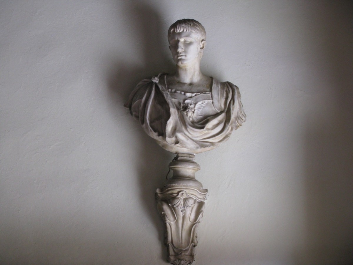 Serie di quattro busti in gesso modellato raffiguranti imperatori romani togati, Cesare, Nerone, sostenuti da mensola sagomata e decorata da volute con conchiglia.. n.p
