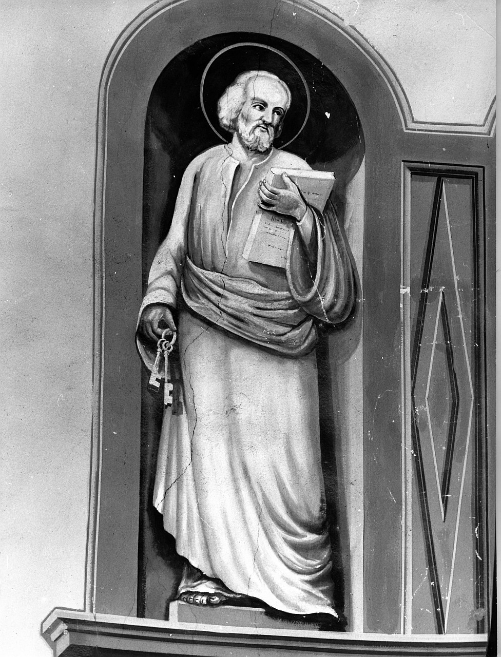 Il dipinto rappresenta san Pietro nella iconografia tipica con le chiavi e il libro. La figura è massiccia con una lunga tonaca tagliata in vita da una lunga fascia. Gli occhi del santo guardano un punto indefinito alla sua sinistra. L'immagine è inserita in una finta nicchia a tutto sesto. Personaggi: san Pietro. Abbigliamento: veste bianca; mantello bianco. Attributi: (san Pietro) chiavi; libro