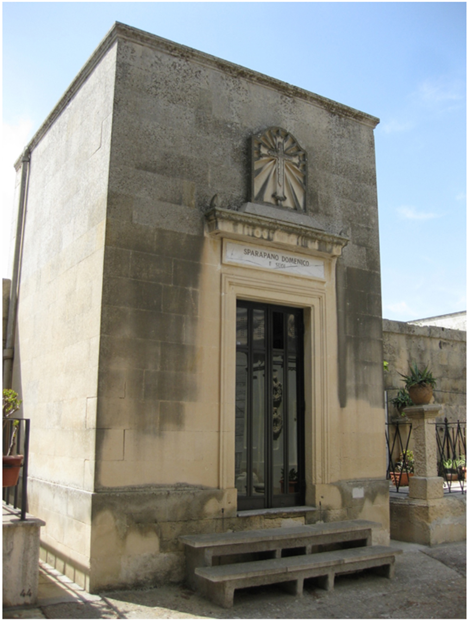 elementi decorativi: blocco lapideo (con croce raggiante, pietra calcarea locale), prospetto principale, in sommità