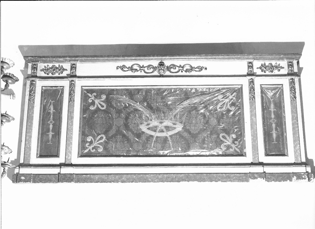 Paliotto in legno intagliato e dorato, con tessuto in damasco di seta di colore rosso. Sul damasco sono ricamate due palme entro una corona, nei quattro angoli fiori stilizzati. Sul pannello superiore della cornice vi è un decoro floreale dorato.. Soggetti sacri. Simboli: (martirio) palme. Decorazioni: elementi floreali stilizzati; volute